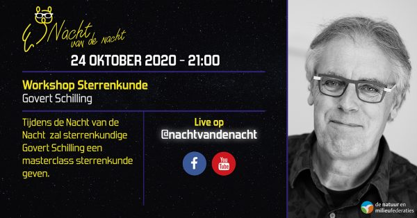 Govert Schilling is al jaren ambassadeur van de NachtvandeNacht en is freelance wetenschapsjournalist en publicist. Hij schrijft over sterrenkunde en ruimteonderzoek voor kranten en tijdschriften in binnen- en buitenland. Hij publiceerde tientallen boeken over uiteenlopende sterrenkundige onderwerpen, waarvan sommige zijn vertaald, o.a. in het Engels, Duits en Chinees. Regelmatig geeft hij op radio en tv toelichting op ontwikkelingen in de astronomie. Daarnaast verzorgt hij publiekslezingen en cursussen, en is hij eindredacteur van de populaire website allesoversterrenkunde.nl