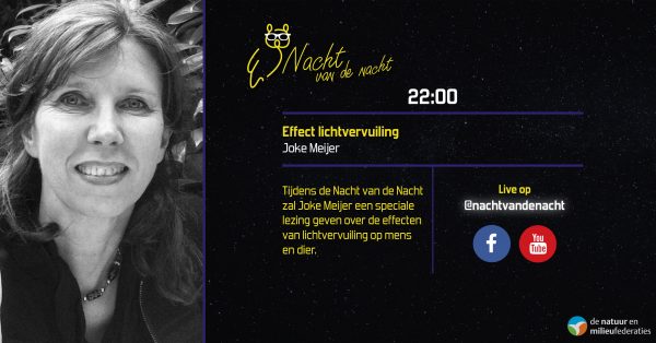 Professor Joke Meijer is de 16e ambassadeur van de NachtvandeNacht en is de expert op het gebied van de biologische klok. In haar lezing gaat ze in op de negatieve effecten van licht(hinder) op mens en dier. Waarom is donkerte zo belangrijk voor ons en wat zijn de gevaren van te veel licht op onze gezondheid en op de overlevingskans van nachtdieren. Kortom een hele andere invalshoek die belangrijk is om eens goed te ‘belichten’.